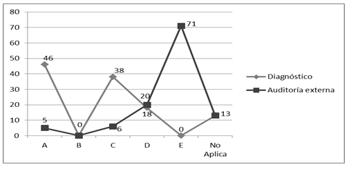 Posteriormente, se contrastaron los resultados obtenidos en el diagnóstico inicial y la última auditoría externa realizada, con relación a la implementación de los procesos. Para esto se consideraron los valores de cumplimiento definidos en la Tabla 1 del presente trabajo. En la Figura 4 se muestran los resultados en ambos casos, evidenciándose una marcada diferencia y la tendencia positiva de implementación de los requisitos definidos en las normas. El eje de las x lo definen los valores de cumplimiento y el eje de las y la cantidad de requisitos definidos en las normas.