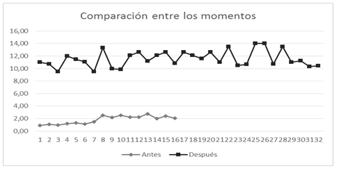 Para comparar las observaciones correspondientes a los dos momentos analizados (antes y después de la propuesta) se aplica el test no paramétrico de signos con rangos de Wilcoxon, evidenciándose diferencias significativas entre estos. En la siguiente gráfica se muestran los valores µ de los artefactos probados en ambos momentos (ver Figura 5). Se representa en el eje de las x la cantidad de portales web probados en el laboratorio y en el eje de las y los valores obtenidos de µ según el cálculo definido anteriormente:
