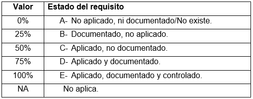 Diagnóstico: Se realiza con el objetivo de conocer la situación en la que se encuentra el laboratorio en materia de gestión de la calidad, así como evaluar el grado de adecuación a lo planteado por las normas NC-ISO/IEC 17025:2006 y NC-ISO/IEC 9001: 2008, que permiten la posterior acreditación y certificación de la organización respectivamente. Para desarrollarlo se elaboró una lista de chequeo considerando el documento Guía de requisitos complementarios, en el que se definen un conjunto de requisitos específicos, tanto de gestión como técnicos en función de la acreditación de ensayos o pruebas al software. Al aplicar la lista de chequeo se identifica el estado de cada requisito, ponderando los resultados según los valores definidos en la Tabla 1.