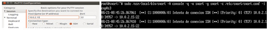 La regla genera una alerta de una conexión no permitida de SSH, esta regla tiene un comportamiento sospechoso en el protocolo TCP desde cualquier dirección IP de origen y puerto origen. Tiene como dirección de IP destino 10.0.2.15 y puerto de destino 22. El mensaje que emite la alerta en el IDS Snort es “Conexión SSH detectada”, para verificar la regla anterior utilizaremos la herramienta PuTTY desde donde podemos conectarnos a servidores remotos, ingresando el nombre o dirección IP del host y puerto, ver (Figura 10).