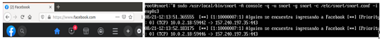 Alerta de ingreso a Facebook: La regla genera una alerta de una conexión a Facebook, esta regla tiene un comportamiento sospechoso en el protocolo TCP desde cualquier dirección IP de origen y puerto origen. Tiene como dirección de IP destino $HOME_NET y puerto de destino ANY. El mensaje que emite la alerta en el IDS Snort es “Alguien se encuentra ingresando a Facebook”, ver (Figura 11).