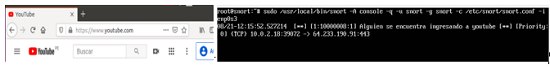 Alerta de ingreso a YouTube: La regla genera una alerta de una conexión a YouTube, esta regla tiene un comportamiento sospechoso en el protocolo TCP desde cualquier dirección IP de origen y puerto origen. Tiene como dirección de IP destino $HOME_NET y puerto de destino ANY. El mensaje que emite la alerta en el IDS Snort es “Alguien se encuentra ingresando a YouTube”, ver (Figura 12).