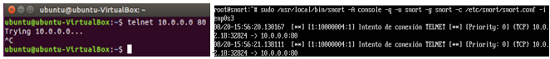Intento de conexión TELNET: La regla genera una alerta, con un comportamiento sospechoso en el protocolo TCP desde cualquier dirección IP de origen y puerto origen. Tiene como dirección de IP destino $HOME_NET y puerto de destino 80. El mensaje que emite la alerta en el IDS Snort es “Intento de conexión TELNET”, ver (Figura 8).