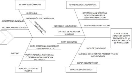 En el diagnóstico realizado ha sido posible identificar los problemas presentes en la gestión de la Maestría, relacionados principalmente con la carencia de un sistema de gestión documental, así como otros problemas que necesitan de una solución a corto plazo. Una técnica reconocida, es el diagrama de causa-efecto o el diagrama de Ishikawa que en este trabajo expone las causas y subcausas del problema planteado. Figura 1