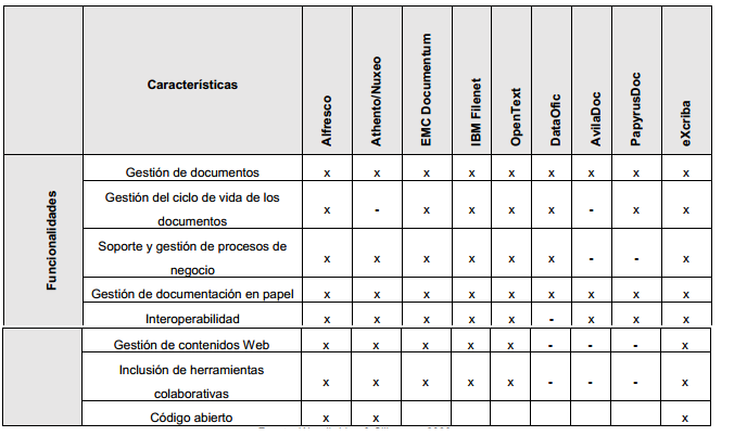 Teniendo en cuenta que el sistema es una personalización avanzada de Alfresco en su versión Community 5.2.f, se muestra una comparación realizada durante el estudio que resalta las características y funcionalidades que sobresalen en esta plataforma con respecto a otras similares que forman parte del estado del arte y de igual manera son dedicadas a garantizar la gestión de documentos. Tabla 1