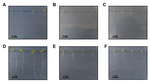 Se desinfectaron las semillas de Arabidopsis thaliana Columbia (Col-0) con etanol al 70% por 15 minutos y etanol al 96% por 5 minutos y posteriormente se realizaron 3 enjuagues con agua destilada estéril. Luego de vernalizar durante dos días a 4°C, se cultivaron in vitro por una semana en el medio de cultivo MS 0,5X con la adición de 0,8% (m/v) de agar (Murashige y Skoog, 1962) con fotoperíodo de 16 horas de luz y 8 de oscuridad a una temperatura de 21 a 23°C. Se seleccionaron aquellas plántulas que presentaban un crecimiento similar y se establecieron en placas de Petri (Grossi, y otros, 2020). Para el tratamiento control se utilizaron 3 placas con MS 0,5X y para los tratamientos de estrés abiótico se prepararon 4 placas con MS 0,5X conteniendo 75 mM NaCl (salino) o 100 mM manitol (osmótico). Se colocaron 4 plántulas por placa; la medición de la longitud de la raíz primaria de cada plántula fue realizada diariamente durante 7 días tanto a las plantas control como a las tratadas utilizando el software ImageJ (Rueden y Eliceiri, 2019).