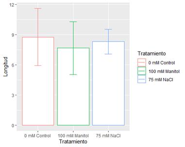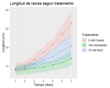 Luego de cargar los datos de longitud de raíces en el archivo Excel se los importó al ambiente de RStudio y se usó el paquete Plantico. Para visualizar los datos como un gráfico de líneas con la desviación estándar como sombreado, se utilizó la función >Grafico_lineas_tiempo_t capaz de plasmar los resultados obtenidos a lo largo de 7 días. Como se observa en la Figura 2, en todos los tiempos del ensayo, las plantas que presentaron mayor longitud de raíces fueron las de la condición control, seguido por las condiciones de estrés con NaCl y manitol, respectivamente.