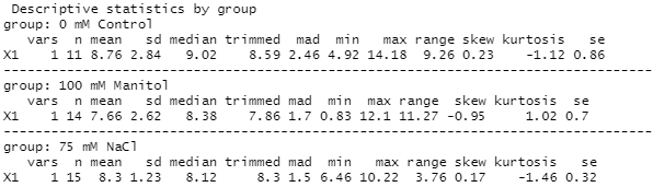 Para obtener datos resumidos de los estadísticos más comunes se creó la función Resumentiempo_t, esta función procesó los datos del tiempo “t” y devolvió la cantidad de variables analizadas (vars), la cantidad de muestras por grupo (n), la media, la desviación estándar (sd), la mediana (mean), el valor mínimo (min) y máximo (max), el rango (range), el error estándar (SE), la media truncada (trimmed), la desviación absoluta media (mad) y los coeficientes skew y kurtosis. Como se observa en la Figura 3 la función ya separa los datos en grupos de acuerdo a los tratamientos del estudio.