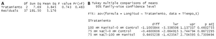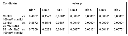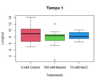 Este paquete permitió el análisis estadístico de los datos recopilados a partir de plántulas de A thaliana que fueron sometidas a estrés salino y osmótico. Las figuras 3, 4, 5 y 6 corresponden al tiempo 1, momento en el que no se observaron diferencias entre los tratamientos. Sin embargo, como se observa en las Figura 1 y Figura 2 y en la Tabla 1, se observó un acortamiento significativo (p < 0,05) en la longitud de las raíces, a partir del día 3 del ensayo, entre la condición control y tratamiento con manitol y también entre manitol y NaCl. A partir del día 4, también se observan diferencias entre el control y el tratamiento con NaCl. Estas diferencias se mantienen hasta el final del ensayo (día 7). Los datos reportados en este trabajo son concordantes con los de otros autores (Van der Does y otros, 2017; Nath y otros, 2019) y con lo reportado previamente por nuestro grupo (Grossi y otros, 2020).