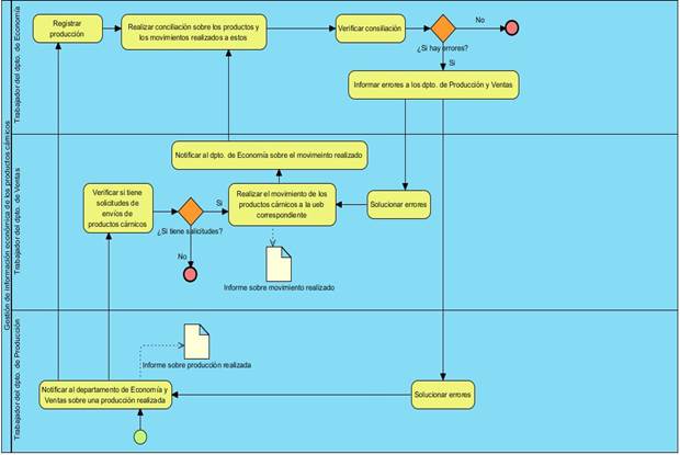 El departamento de economía realiza el proceso de gestión de la información de los productos cárnicos, diariamente el jefe del Departamento de producción entrega mediante un papel manuscrito el parte de las cantidades de productos elaborados. El departamento de ventas es el encargado de la venta de dichos productos, luego de comercializarlos envía un documento con el precio de los productos vendidos al departamento de economía, la jefa de dicho departamento es la encargada de registrar toda la información recopilada en un documento de formato Excel, donde se realiza una conciliación entre la información adquirida entre los departamentos de producción y de venta. Esta conciliación consiste en verificar que las cantidades producidas y las vendidas, así como el dinero ingresado a la empresa estén en correspondencia. Para un mejor entendimiento del proceso de gestión de la información económica de los productos cárnicos de la provincia de Camagüey, se procede al modelado del proceso quedando plasmado en la Figura 1. Utilizando la notación Business Process Modeling Notation (BPMN).