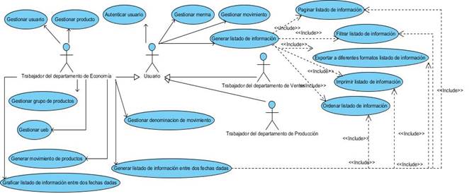 El proceso de identificar, recopilar y analizar las necesidades que presenta un cliente para el desarrollo de una solución software es llamado Ingeniería de Requisitos. Esta disciplina tiene como fin la identificación y especificación de requisitos de un software de forma ordenada y correcta (Moreno, 2019). El sistema está compuesto por 17 requisitos funcionales. Entre ellos los requisitos más importantes considerados como críticos son: gestionar producto y gestionar movimiento. Posteriormente se pasó a la etapa de análisis en el cual se diseñaron los casos de uso del sistema como se muestra en la Figura 2.