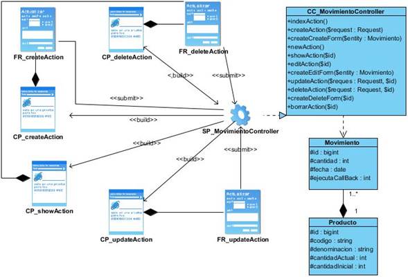 El modelo de diseño proporciona detalles acerca de las estructuras de datos, las arquitecturas, las interfaces y los componentes del software que son necesarios para implementar el sistema. El diseño es la única forma de convertir exactamente los requisitos de un cliente o en producto o sistema de software finalizado. Sirve como fundamento para todos los pasos siguientes del soporte del software y de la ingeniería de software (Pressman, 2008). A continuación, se presenta el diagrama de clases del diseño del caso de uso gestionar movimiento de producto. Figura 3