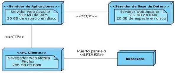 La etapa de despliegue puede ser un fracaso total si no se interactúa con el cliente adecuadamente, no se entrega el producto como este exige, del mismo modo si no se utilizan prácticas y técnicas que dejen satisfechos al mismo. La siguiente figura representa la relación entre los nodos del modelo de despliegue, donde el nodo cliente representa cualquier máquina que interactúa con la aplicación, a su vez puede estar comunicada con una impresora mediante el puerto LTP o USB para la impresión de los reportes. Esta PC además cuenta con un navegador para realizar las peticiones al Servidor Web mediante el protocolo Http el cual interactuando con el Servidor de Base de Datos responderá a las peticiones realizadas. Figura 4
