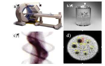 Se adquirieron imágenes tomográficas en una cámara gamma E.CAM SCINTRON 7 de la firma Aleman MiE Medical Imaging Electronic (Figura 1 a). El detector de la cámara gamma (cristal de NaI (Tl) con colimador de plomo de huecos paralelos), se rotó en 360 grados alrededor del maniquí y se adquirieron sus proyecciones a partir de los sinogramas originales (Figura 1 c). Se empleó la retroproyección filtrada (FBP) como método de reconstrucción tomográfica, para obtener los cortes (2D), a partir de filtrado Rampa + Butherworth (Añé, 2017). Para aplicar los métodos de reducción de ruido por TV se escogió un corte coronal, donde se aprecian todas las simulaciones de lesiones de diferente diámetro presentes en el maniquí. (Figura 1d). Para evaluar la calidad de imagen del método se emplearon métricas cuantitativas en las regiones de interés o ROI (Figura 1c).