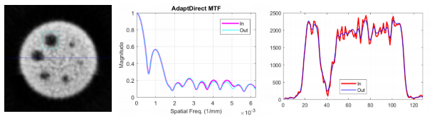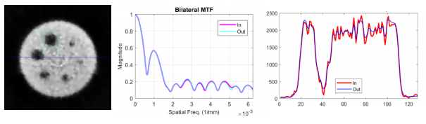 Es una evidencia de cuánto ruido se retiró de la imagen y cómo esto varió la intensidad de cada píxel. Obsérvese que la imagen de salida contiene la información estructural prácticamente intacta, pero en las zonas de bordes (picos de la gráfica) se hace un suavizamiento. Se puede apreciar en qué medida se atenúan los pequeños detalles de la imagen con las variaciones de intensidad al pasar por distintas regiones. Respecto a la resolución espacial, descrita a través de la MTF (Fig. b), se puede observar que prácticamente no hay pérdidas para todo el rango de frecuencias espaciales. Las curvas de entrada y salida quedan superpuestas en todo el diapasón de frecuencias, y solo al nivel de detección (10 % de la MTF) se ven diferencias mínimas.