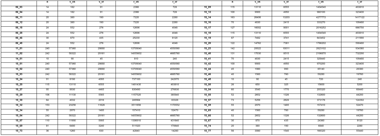 La Tabla 2 muestra para cada fichero PWG una comparación entre la cantidad de variables para MPLE (v_vn) y la cantidad de variables para RMPLE (v_vr). Además, se comparan la cantidad de restricciones para MPLE (r_vn) y la cantidad de restricciones para RMPLE (r_vr).