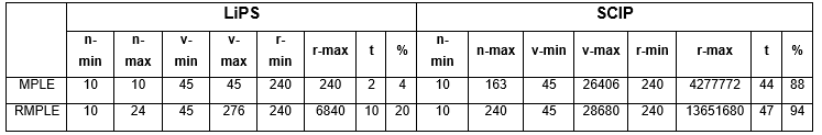 La Tabla 4 muestra una comparación en cuanto al tiempo de solución (en segundos) de cada una de las instancias con LiPS para MPLE (LiPS_tvn) y RMPLE (LiPS_tvr) y con SCIP para MPLE (SCIP_tvn) y RMPLE (SCIP_tvr). Las celdas con espacios en blanco son resultado de instancias que no se le pudo dar solución con el solver debido a sus dimensiones.