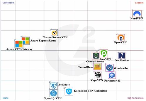 Según (Skendzica y Kovacic 2017), algunos de los elementos considerados para seleccionar un servidor VPN son su compatibilidad con diferentes protocolos red, su capacidad para la creación de logs y su monitoreo, las aplicaciones cliente soportadas y los precios de sus licencias. En esta investigación se realizó la selección del servidor VPN en 2 pasos fundamentales y sobre la premisa de que fuera una solución libre de código abierto. En un primer momento se realizó un estudio de las principales tendencias del mercado, la Figura 2 muestra los servidores VPN líderes en el mercado mundial durante 2021 según el sitio G2 Crowd Inc.