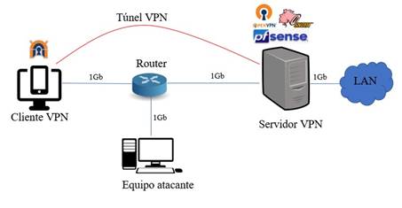 El autor (León 2018) implementó una VPN mediante pfSense y OpenVPN en el entorno real de una empresa en la ciudad de Xalapa. Este autor evaluó indicadores de rendimiento como latencia, ancho de banda y pérdida de paquetes en la red VPN. Aunque la distancia geográfica entre los clientes y la solución influyó en sus índices de rendimientos, OpenVPN fue capaz de mantener la disponibilidad de los servicios en la red virtual con un uso óptimo de los recursos de hardware (León 2018). En su tesis (León 2018), no evaluó el comportamiento de la solución ante ciberataques.