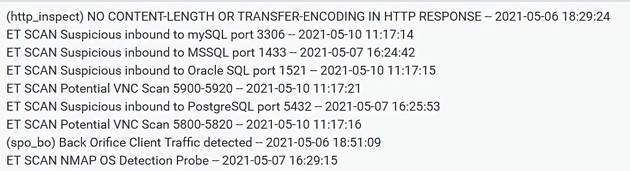 OpenVPN crea por defecto un túnel de conexión mediante el protocolo UDP por el puerto 1194, por tal motivo, se realizó un escaneo de puertos al firewall pfSense con la herramienta nmap para identificar posibles vulnerabilidades asociadas a este servicio. Durante el escaneo se solapó la dirección IP del ordenador atacante para evadir el IDS utilizado y se verificó la existencia de puertos adicionales abiertos para servicios UDP y TCP. Snort identificó esta actividad como tráfico de red malicioso y automáticamente bloqueó los IP atacantes, la Figura 5 describe las alertas arrojadas por Snort durante el empleo de nmap.