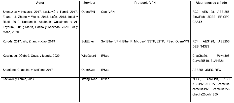 Aunque las herramientas comerciales dominan ampliamente el mercado, se identificó que la solución libre OpenVPN posee un posicionamiento positivo dentro de este. En un segundo momento se realizó un análisis de la literatura y se identificaron los servidores VPN más estudiados por los autores consultados. La Tabla 1 muestra las soluciones identificadas y sus principales características.