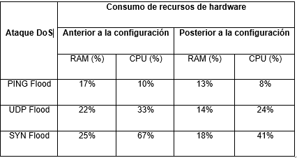 Las reglas configuradas en la interfaz WAN del firewall permitieron disminuir el consumo de RAM y CPU de la solución durante los ataques DoS realizados, esto contribuye a garantizar la disponibilidad de estos recursos para atender las solicitudes de conexión de los clientes con acceso a la VPN.