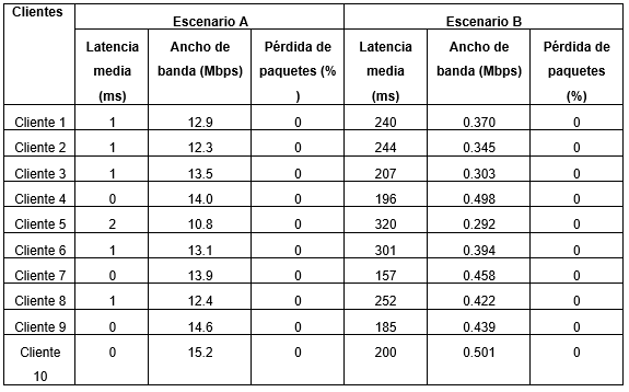 La calidad de las conexiones VPN es limitada por las condiciones del servicio de Internet sobre el que operan, esto puede ocasionar variaciones en la velocidad de transmisión, bajas de rendimiento o fallas externas resultado de condiciones climáticas o del entorno (León, 2018). Para comprobar el rendimiento de la solución se ejecutó la herramienta iPerf3 y el comando PING en los escenarios A y B respectivamente. En ambos escenarios las pruebas se ejecutaron con 10 clientes conectados simultáneamente a la solución, en el caso del escenario B, los clientes se ubicaron a 11 km de distancia de la empresa y utilizaron como punto de acceso a Internet los datos móviles de sus teléfonos celulares. La Tabla 3 muestra la latencia, ancho de banda y pérdida de paquetes de las conexiones VPN establecidas en ambos escenarios.