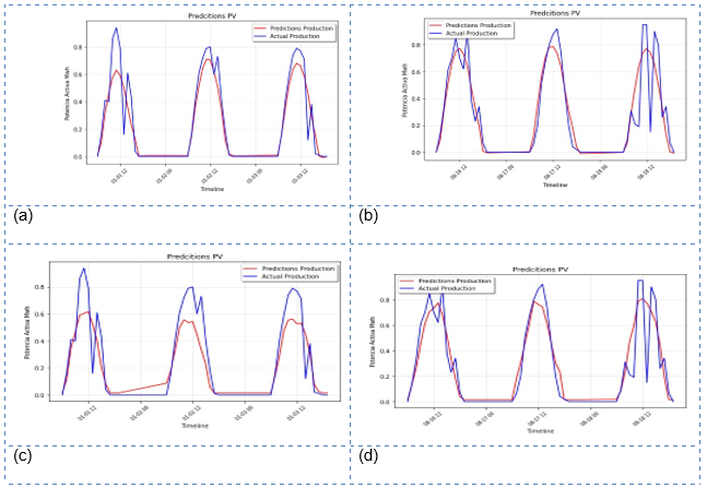 En este caso al tratarse de predicciones de más de 24 horas (se predicen tres días en el futuro) se pueden considerar como predicciones a largo plazo. En el caso (a) se utiliza el modelo LSTM para predecir los días 1, 2 y 3 de enero 2020. En el caso (b) se emplea nuevamente el modelo LSTM para predecir la generación de potencia activa en los días 16, 17 y 18 de agosto 2020. En el caso (c) se utiliza el modelo CNN para realizar la predicción en los días 1, 2 y 3 de enero 2020. En el caso (d) se emplea también el modelo CNN para realizar la predicción en los días 16, 17 y 18 de agosto 2020. En cada uno de los casos se utiliza 8 días anteriores para la predicción.