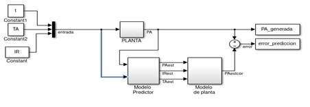 La idea de aplicar técnicas de inteligencia artificial es determinar un modelo global que se base además en los valores de la potencia generada, los cuales contienen toda la información del comportamiento de la planta en las condiciones reales de operación. La Figura 2 muestra la estructura general del modelo propuesto para la predicción de la potencia generada y su relación con la planta fotovoltaica. Consiste en un modelo principal, con tres entradas independientes, la Irradiación IR, la temperatura del aire TA y el tiempo que transcurre, t; y n valores pasados de la potencia real generada por la planta. A partir de esta entrada combinada, el modelo principal proporciona una predicción del comportamiento de la potencia generada, PAest, de la irradiación estimada IRest y la temperatura del aire TAest para las próximas 24 horas.