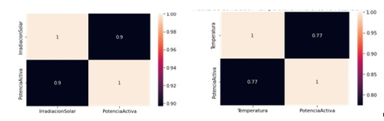 Otra entrada a tener en consideración es la variable temperatura ambiente la cual influye en la eficiencia de conversión de la energía solar-fotovoltaica en energía eléctrica (Paulescu et al. 2013). Para el desarrollo del modelo se obtuvieron los juegos de datos de la potencia activa, la temperatura ambiente y la irradiación solar de una base de datos SQL ubicada en el PSFV de la UCLV. Los datos comprenden las mediciones de estas tres variables en cada hora durante los años 2019 y 2020. En esta base de datos se pudo constatar pérdidas en las mediciones de los datos, para un total de 80 días (1920 juegos de datos) totalmente en blanco que se decidieron eliminar ya que afectaba el comportamiento de las tres variables; también se detectaron algunas mediciones nulas puntuales que se corrigieron mediante el procesamiento de los datos, así como valores anormales en estas variables. Se pudo evidenciar la fuerte correlación existente entre las variables de entrada y la variable de salida utilizando la correlación de Spearman, ya que las relaciones entre las variables eran monótonas. En los resultados mostrados se observa que existe una fuerte correlación entre las variables de entrada y la variable de salida como se muestra en la Figura 3.