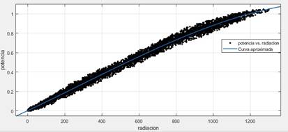 Es posible obtener una curva aproximada para la generación de potencia activa de la planta fotovoltaica en función de la irradiación solar. La figura 4 muestra un gráfico de dispersión de irradiación vs potencia activa y la curva aproximada de comportamiento para estos datos específicos.