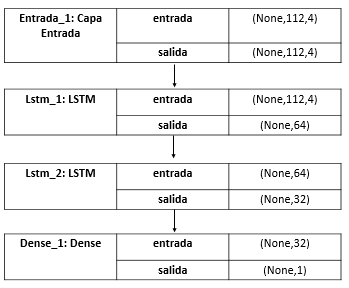 En la Figura 6 se muestra el primer modelo de red neuronal. La capa de entrada conformada por 4 neuronas que representan los atributos (Irradiación, Temperatura Ambiente, Temperatura Módulo, Potencia Activa) por cada una de las 112 horas presentes en cada ejemplo de entrenamiento, dos capas LSTM (Qing, Niu 2018), la primera con 64 neuronas y la segunda con 32 neuronas, la salida es la generación de energía del día siguiente pasadas las 112 horas (Figura.7).