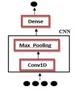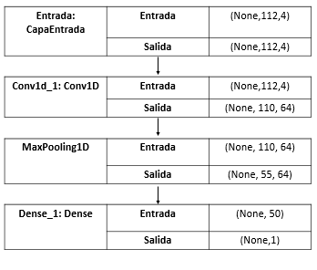 La Figura 8 representa el segundo modelo con una topología de red CNN (Rui Zhang et al. 2018) con una capa Convolucional (Conv1D) de 1 dimensión de 64 filtros, seguida de una capa de reducción por agrupamiento (max_pooling) con tamaño dos y una capa Densa de 50 neuronas. La capa de entrada igual a la de la Figura 7.