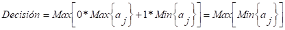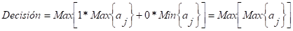 Para / representa un estado medio conocido como criterio de Hurwicz. Propuesto por Hurwicz en 1951 (Hurwicz, 1957), se puede considerar como una combinación entre el criterio optimista y el criterio pesimista. Consiste en ponderar un coeficiente de optimismo y otro de pesimismo al mejor y peor caso respectivamente, se suman los dos valores y se escoge aquella alternativa que proporcione un mayor resultado. Se formula tal como muestra la ecuación 6: