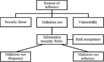 Herewith a risk is calculated for every malicious use by means of combination of its frequency with one of influences. It means that malicious use leads to appearance of one or many information security risks depending on amount of interconnected factors (frequency and influence). Both indexes (frequency and influence) can be defined with quantitative estimation metric basing on data from public sources, one of which is NVD Common Vulnerability Scoring System Support (CVSS).