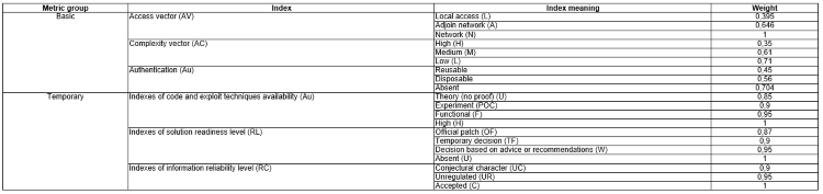 Using of three basic metric indexes and three temporary metric indexes allows evaluating malicious use frequency (how often vulnerability is the subject to exploit influence). Basic metric describes vulnerability characteristics and its liability to exploit influence because these indexes are chosen for determination of primary frequency.