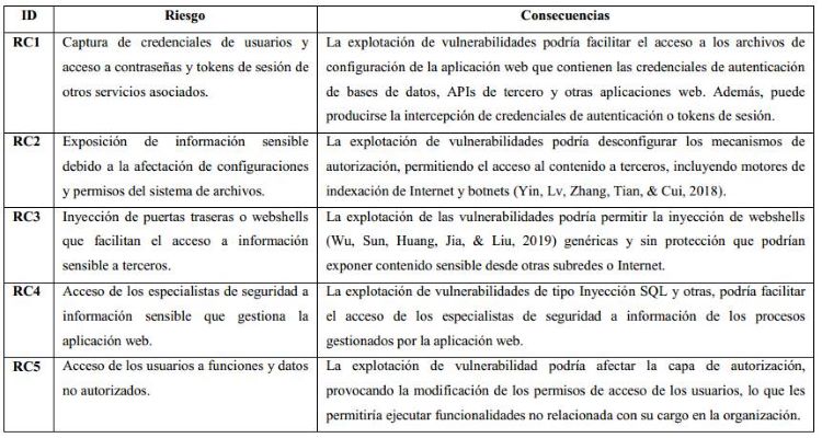 Desde la dimensión de la aplicación web como producto de software, los riesgos de seguridad pueden agruparse según el nivel de afectación que pueden causar a la confidencialidad, integridad y disponibilidad en los datos y procesos relacionados con la aplicación web. En las Tabla 1, Tabla 2 y Tabla 3 se enuncian los principales riesgos de seguridad relacionados: