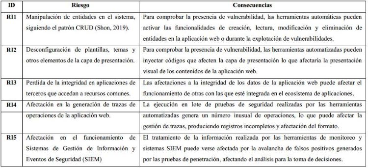 A pesar de ser una práctica reconocida en el campo de la ciberseguridad, la aplicación de las pruebas de penetración tiene asociada un grupo de riesgos que pueden afectar tanto a los sistemas objetivos como el propio proceso de evaluación, lo que puede conllevar afectaciones debido a posibles daños provocados a la aplicación web o la obtención de resultados deficientes para la toma de decisiones en esta área.