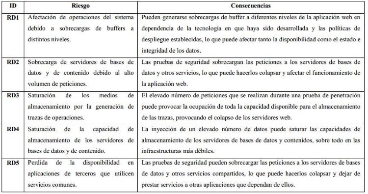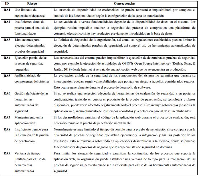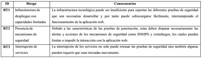 Las características de la infraestructura tecnológica pueden generar riesgos que dificulten la ejecución de la prueba de penetración en aplicaciones web. Estos riesgos se enumeran en la Tabla 5: