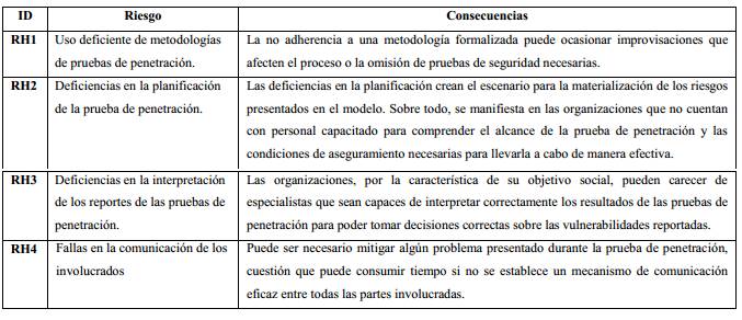 Tener en cuenta el factor humano es esencial en cualquier proceso y por tanto en una prueba de penetración en aplicaciones web. En la Tabla 6 se enuncian los principales riesgos asociados:
