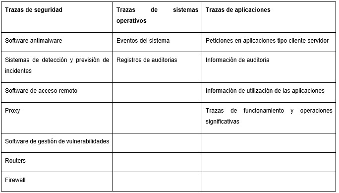 Las trazas poseen una gran relevancia en la gestión de la seguridad informática, debido a que la información que en ellas se registran contribuye en las actividades de auditoría y análisis forense, en el apoyo a investigaciones internas, establecimiento de líneas base y en la identificación de tendencias operacionales y problemas de comportamiento de los sistemas de información. Según el tipo de aplicaciones, se tienen trazas de software asociadas directamente a la seguridad y trazas relativas a los sistemas operativos, las aplicaciones y servicios que se encuentran en ejecución (Schipper et al., 2019).