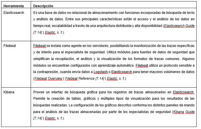 Las comunicaciones entre cada uno de las capas se realizan en banda o fuera de banda en función de los requisitos de seguridad de cada organización. En el primer caso se utilizará la red de la organización que se está monitorizando, en este caso deben tomarse medidas adicionales de seguridad durante el proceso de recolección de las trazas para no inducir vulnerabilidades. También puede desplegarse una red independiente para la comunicación entre las capas de la infraestructura. Una vez generadas las trazas, una herramienta se encarga de recolectarlos y enviarlos para su posterior almacenamiento e indexación, permitiendo las funciones de visualización y análisis de las trazas. Cada uno de las capas de la arquitectura están formado por herramientas que trabajan de forma integrada. La utilización de varias herramientas y su instalación requiere del manejo de múltiples ficheros de configuración.