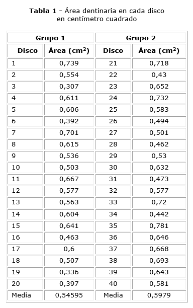 En la tabla 1 se aprecian los valores del área dentinaria de cada disco, obtenidos al usar el programa IMAGE J.