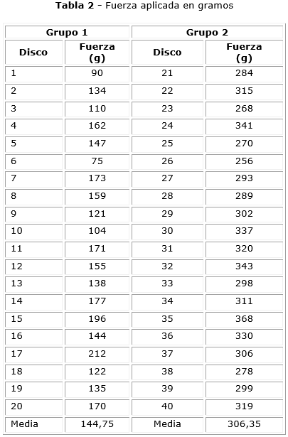 Según se puede apreciar en la tabla 2, los valores de fuerza aplicados en el grupo 2 superan en poco más del doble a los alcanzados en el grupo 1.