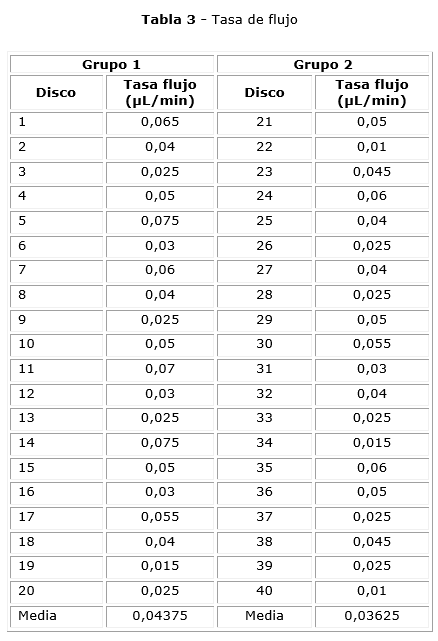Los valores de tasa de flujo en la cámara de Pashley experimentaron una disminución de aproximadamente un 20 % en el grupo 2 con respecto al primer grupo (tabla 3).