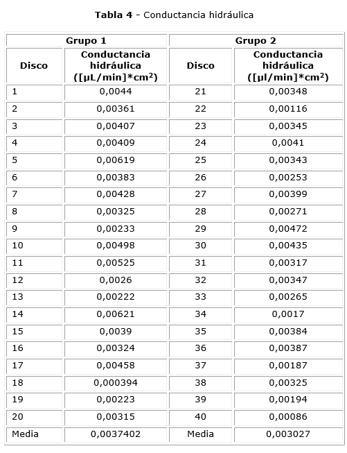 El resultado de esta fórmula determinó finalmente la permeabilidad de cada uno de los discos de dentina.