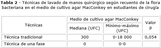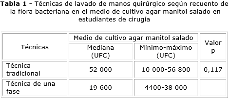 Abstract: Introduction: Surgical hand scrubbing is indispensable to prevent postoperative infection at the intervention site, a problem both current and in progress. Objective: Determine the most effective surgical hand scrubbing technique against bacterial flora among surgery students. Methods: A controlled randomized study was conducted of non-pharmacological treatments. Twelve surgery students were selected from the School of Dentistry at the University of San Martín de Porres who met the inclusion and exclusion criteria. The students were divided into two groups and assigned one of two surgical hand scrubbing techniques: Group A: one-step technique and Group B: traditional technique (three steps). Both techniques used bar soap and a brush. Results: In the culture medium mannitol salt agar, the traditional technique obtained a median of 52 000 CFU/mL, with a minimum 10 000 CFU/mL and a maximum 56 800 CFU/mL, whereas the one-step technique obtained a median of 19 600 CFU/mL, with a minimum of 4 400 CFU/mL and a maximum of 38 000 CFU/mL (p= 0.117). In MacConkey agar, the traditional technique obtained a median of 300 UFC/mL, with a minimum of 0 CFU/mL and a maximum of 18 000 CFU/mL, whereas the one-step technique obtained 0 UFC/mL (p= 0.054). Conclusions: No statistically significant differences were found in the groups.
