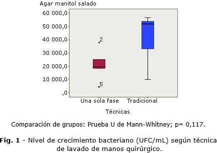 Ambas técnicas de lavado de manos quirúrgico presentaron gran cantidad de unidades formadores de colonias (UFC). En la tabla 1 y figura 1, se aprecia los resultados obtenidos en el medio de cultivo agar manitol salado. Se encontró que no existe diferencia estadísticamente significativa entre los grupos, con p= 0,117.