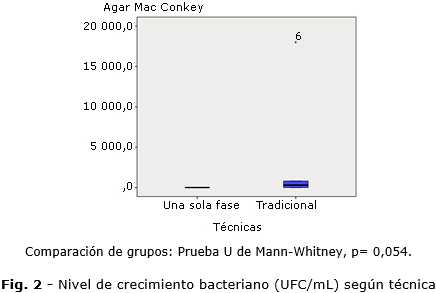 En la tabla 2 y figura 2 se aprecia los resultados obtenidos en el medio de cultivo agar MacConkey. Se encontró que no existe diferencia estadísticamente significativa entre los grupos, con p= 0,054.