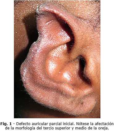 Acude a consulta externa de Cirugía Maxilofacial del Hospital Universitario "General Calixto García" un paciente masculino de 26 años, con antecedentes de salud aparente. Refiere haber sido tratado en el cuerpo de guardia 10 días atrás, al haber perdido un fragmento de oreja por una mordida en una riña. Al examen físico se constata la existencia de una pérdida parcial irregular de la oreja derecha de espesor total, de los tercios superior y medio (Fig. 1). Se considera que se trata de una deformidad auricular adquirida postraumática, por los datos aportados por el interrogatorio, y se descarta que la etiología sea congénita, o adquirida por otras causas, como la exéresis de lesiones patológicas de la zona.